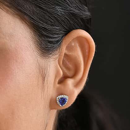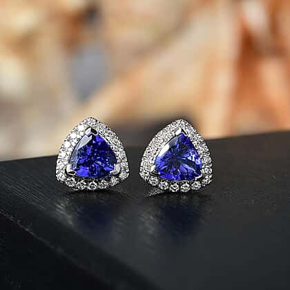 Make a commanding style statement with these appraised & certified AAAA tanzanite halo earrings by RHAPSODY, set in high-quality 950 platinum. Featuring rare trillion-cut AAAA tanzanite gems, each stone glows with vivid violet-blue brilliance and fiery sparkle. A halo of EF-VS white diamonds adds ornate elegance and refined clarity. Crafted in hypoallergenic, tarnish-resistant 950 platinum, these earrings are perfect for sensitive skin and long-lasting wear. The gemstones are robust, retaining brilliance and structure over time. Intricately designed with a secure screw-back post, they offer elegance and comfort in one. Certified and appraised, this pair is a powerful expression of prestige, artistry, and timeless sophistication.