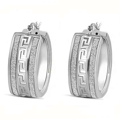 Rhodium Overlay Sterling Greek Key Hoop Earrings with Sand Dust, Silver Wt. 7.40 Gms
