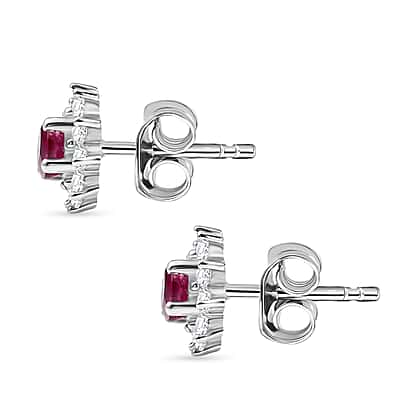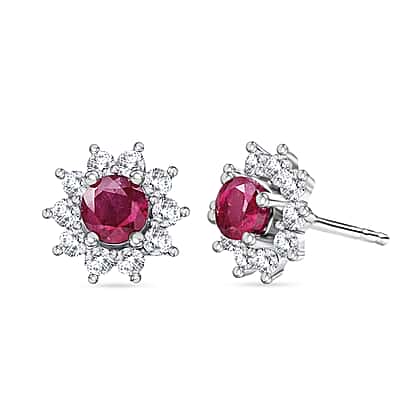 Royal Bali Collection - D'Joy African Ruby & White Zircon Halo Earring with Push Back in Rhodium Overlay Sterling Silver 1.50 Ct.