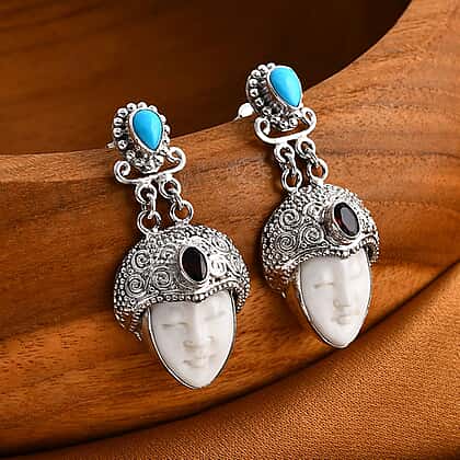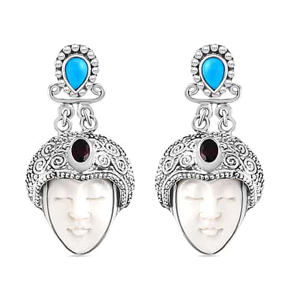 Royal Bali Collection Ox Bone, Red Garnet and Sleeping Beauty Turquoise Earring with Push Back in Sterling Silver 14.59 Ct.