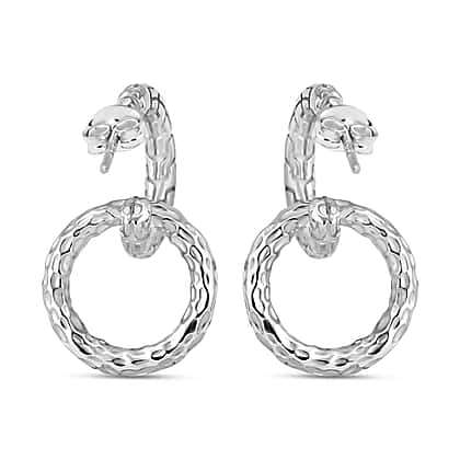 The hammered-style silver drop earrings are a great way to inject some texture and visual interest into your look. It features a half hoop connecting to a lower hoop. Its uneven texture gives it a distinct feel, perfect for those looking to add some edge to their look. They have an organic feel and make for the perfect accessory to express your individualism. These drop earrings have a rounded bottom, which makes them especially suited for square-shaped faces as it helps to soften the angular features and renders a balanced look.