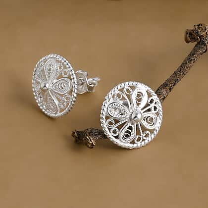 Enhance your look with these silver earrings, thoughtfully designed in a circular medallion form that brings together intricate artistry and balanced composition. The surface is adorned with finely detailed filigree patterns, carefully arranged to create depth, texture, and a soft interplay of light from every angle. This structured design reflects a sense of harmony and precision, while the circular motif is often associated with unity, completeness, and continuity. The polished sterling silver finish further highlights each delicate element, giving the earrings a refined yet expressive presence that transitions effortlessly from everyday wear to more considered occasions.