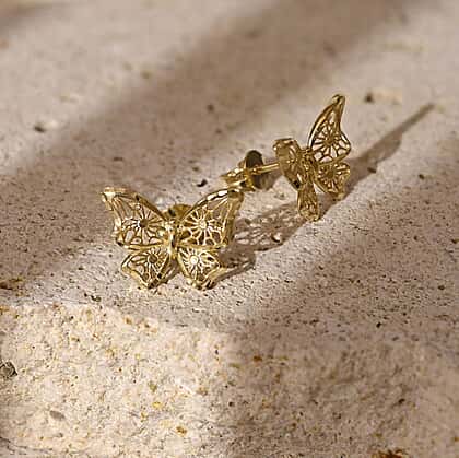 Inspired by the garden theme, these 9K yellow gold butterfly earrings bring a delicate touch of charm to everyday wear. Shaped with graceful openwork wings, the design captures the light beautifully and adds a sense of movement when worn. Each earring is crafted in solid 9K gold, making it both hypoallergenic and suitable for sensitive skin, with the added assurance of no tarnish or discolouration over time. The butterfly symbolises transformation and freedom, making this pair meaningful as well as stylish. Lightweight and easy to wear, these studs are perfect for gifting or for adding a little personality to your jewellery collection.