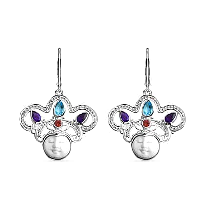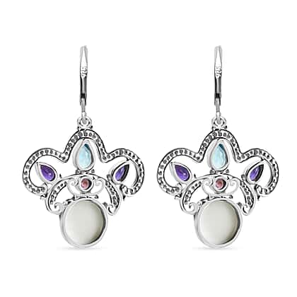 Royal Bali Collection Ox Bone, Swiss Blue Topaz, African Amethyst & Multi-Tourmaline Earring with Lever Clasp Sterling Silver 6.08 Ct, Silver Wt. 5.11 Gms.