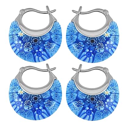 Set of 2 - Blue Colour Murano Style Basket Earrings in Stainless Steel