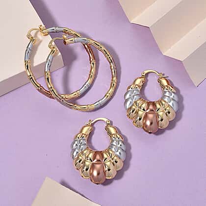 Bring depth and personality to your look with this set of 2 hoop earrings, as they display sculpted curves and textured tri-shade panels. The rounded head flows into a smooth gallery line, while the hinged clasp secures neatly without tugging. Soft contours at the inner bridge keep them comfortable for day-long wear, and the mixed tones feel expressive and uplifting. Each hoop creates a sense of movement, recalling themes of individuality and confidence, making this set an easy way to refresh everyday looks with something beautifully characterful.