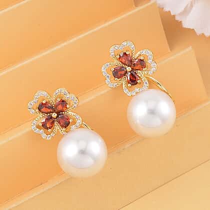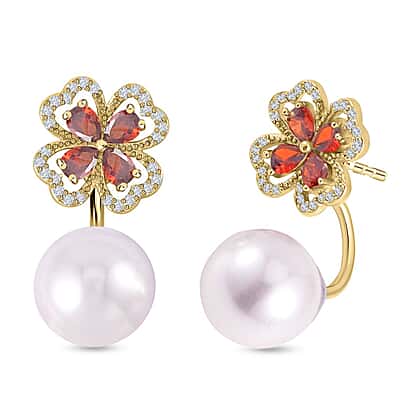 Shell Pearl and Simulated Red Sapphire Stud Earrings in Yellow Gold Tone
