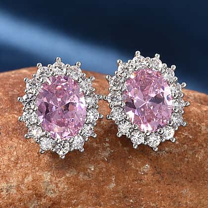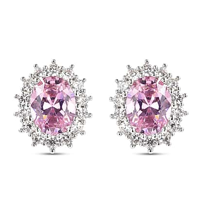 Simulated Diamond and Simulated Pink Sapphire Halo Stud Earrings in Rose Gold Tone