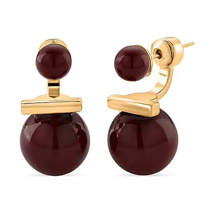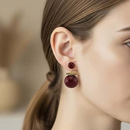A bold fusion of modern geometry and elegant pearls, these red shell pearl bead earrings are inspired by avant-garde art. These double beads earrings feature lustrous red pearls and a golden bar that adds an architectural feel to the design. These sculptural earrings have a floaty feel. The smaller round shell pearl rests as a stud on the earlobe, while the larger one dangles gently below to add movement to the design. Crafted in sterling silver, these earrings feature a gold toned-metal that add warmth to the design. These one-of-kind earrings are an ideal choice for individuals looking for pieces that brew contemporary minimalism.