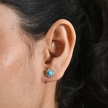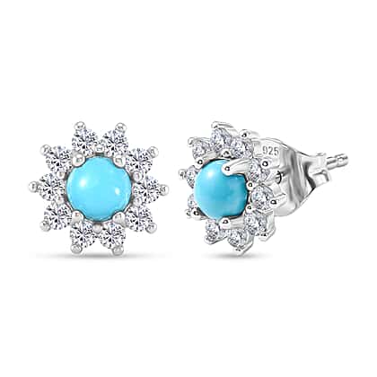 Sleeping Beauty Turquoise & White Zircon Cluster Halo Earring with Push Back in Platinum Overlay Sterling Silver 1.25 Ct.