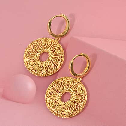 Experience the charm of circular drop design earring that exudes true beauty with intricate design. Expertly crafted with 925 sterling silver for durability and its hypoallergenic metal is safe for sensitive skin. Stunningly finished with yellow gold plating, this exquisite earring with detailed cutwork adds class to any outfit, making it suitable for every occasion. Features hoop fastening for security allowing comfortable wear throughout the day. Claim this piece for everyday sophistication and glamour.