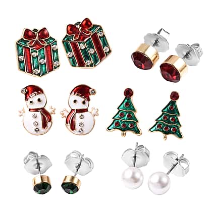 Stocking Filler- Set of 6 - Simulated Pearl, Green, Red and White Austrian Crystal Christmas Theme Enamelled Earrings (with Push Back) in Dual Tone Stainless Steel