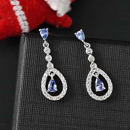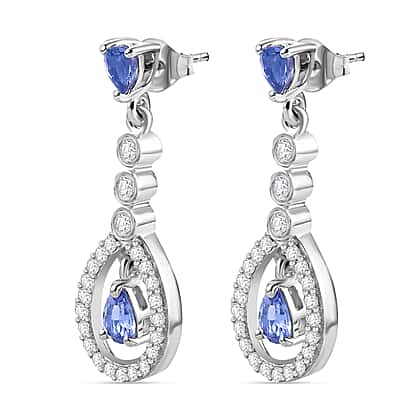 Tanzanite & White Zircon Dangling Earring With Push Back in Rhodium Overlay Sterling Silver