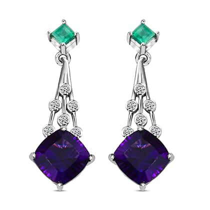 TJC Launch Concave Cut Amethyst, Emerald and Natural Cambodian Zircon Dangle Earrings in Platinum Overlay Sterling Silver 4.86 Ct.