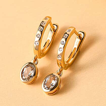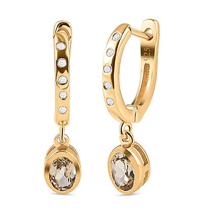 This magnificent pair of earrings comes with turkizite and white zircon with J hoop half design, and three round shaped zircon stone is embedded, which gives a statement look when worn. It is made in sterling silver with vermeil yellow gold plating, making it enduring and robust for prolonged use. In addition, the metal weighs 3.040 grams which makes it extremely lightweight to wear all day long.