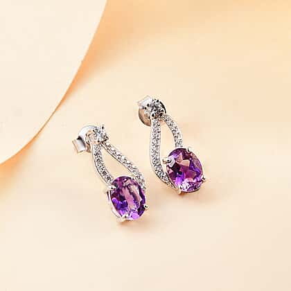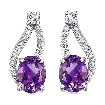 Water Wave Inspired Natural Rose De Morocco Amethyst, White Zircon Solitaire Stud With Push Back Earring in Rhodium Sterling Silver 2.89 Ct.