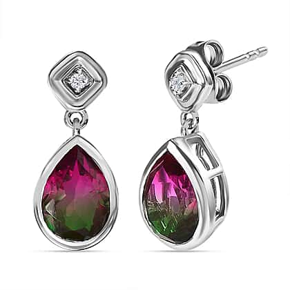 Watermelon Colour Tourmaline Quartz and Natural Zircon Dangle Earrings in Platinum Overlay Sterling Silver 4.23 Ct.