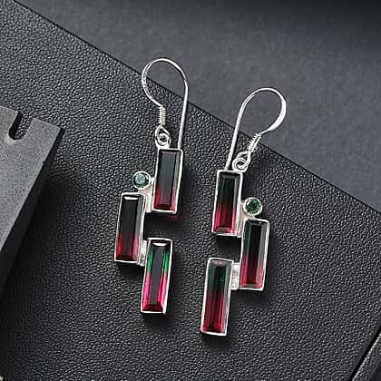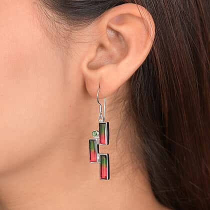 Watermelon Quartz Triplet & Triplet Quartz Earring with Hook in Rhodium Overlay Sterling Silver 12.32 Ct.