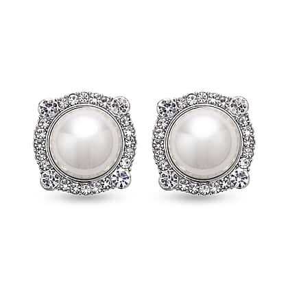 White Austrian Crystal and White Shell Pearl Earrings (With French Clasp) in White Silver Tone.