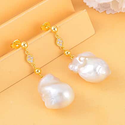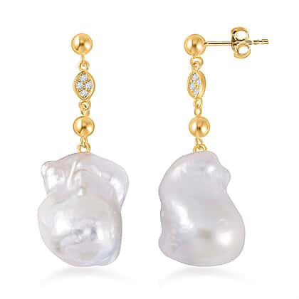 White Baroque Pearl & Natural Zircon Dangle Earrings in 18K Vermeil Yellow Gold Plated Sterling Silver 50.00 Ct.