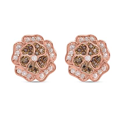 White Diamond and Champagne Diamond Floral Stud Earrings in 18K Vermeil Rose Gold Plated Sterling Silver 0.36 Ct