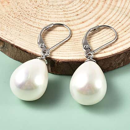 White Shell Pearl Drop Lever Back Earrings in Rhodium Overlay Sterling Silver 25.00 Ct.