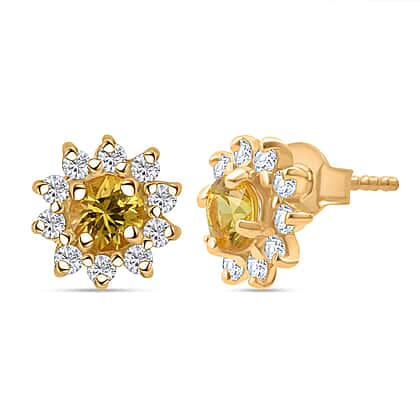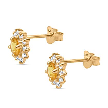 Yellow Sapphire, White Zircon Halo Earring with Push Back in Yellow Gold Plated Sterling Silver 1.11 Ct.