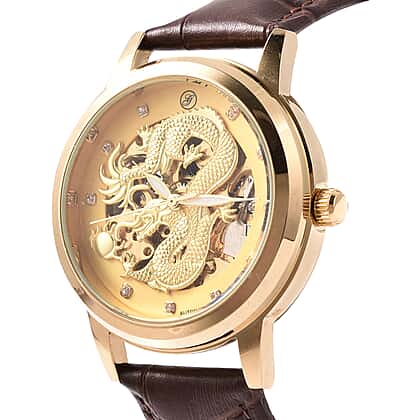 GENOA Automatic Movement White Austrian Crystal Studded Golden Dial Water Resistant Dragon Skeleton Watch in Dual Tone with Brown Leather Strap