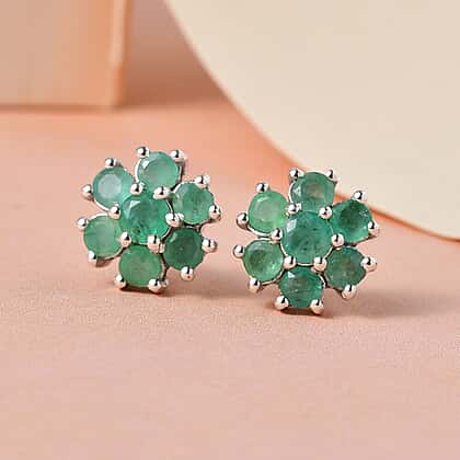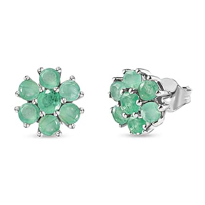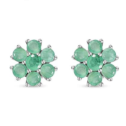 Zambian Emerald Floral Stud Earrings (With Push Back) in Platinum Overlay Sterling Silver 1.474 Ct.