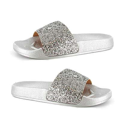 - Silver sliders are adorned with a sparkling sequin detailing