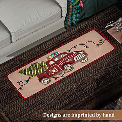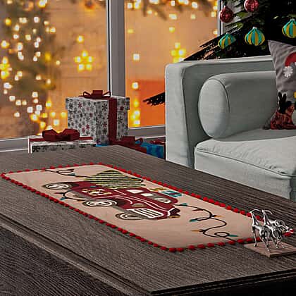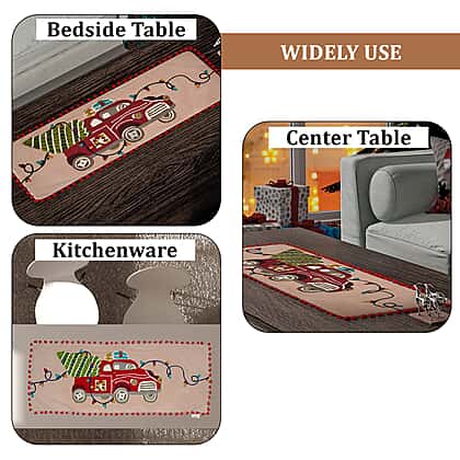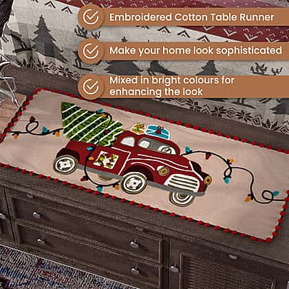 Christmas Tree on Car Embroidered Cotton Table Runner (Size 91x35 Cm) - Beige & Multi