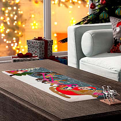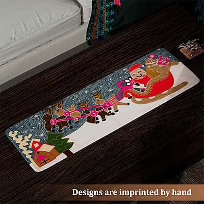This Santa on the sledge printed table runner will elevate the look and soul of your house. It is made from cotton fabric and features crewel aari work mixed in bright colours to give it an enchanting look. This mat has pom-pom detailing around the edges giving it a unique look. You can use this on your centre table, kitchen slab or office to elevate the look.