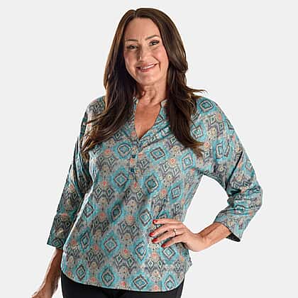Brighten your wardrobe with the Woven Ikat Print Blouse, a versatile piece that effortlessly combines comfort and style. Made from lightweight viscose, this blouse showcases a striking Ikat print with vibrant colours and intricate patterns, perfect for adding a touch of elegance to any outfit. The relaxed fit is complemented by a stylish band collar and a button-up front, allowing you to dress it up or down easily. Three-quarter sleeves offer comfort for everyday wear, making it ideal for casual and semi-formal occasions around the house or when out with friends.
