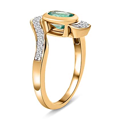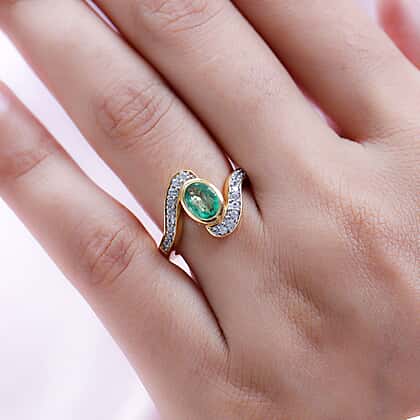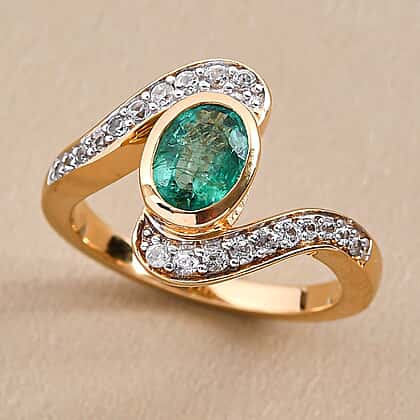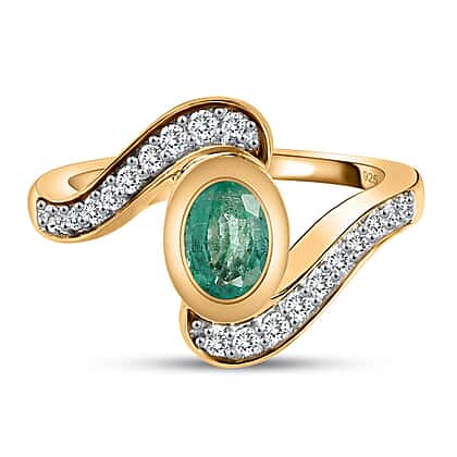 Emerald and Natural Zircon Bypass Ring in 18K Yellow Gold Vermeil Plated Sterling Silver 1.18 Ct.