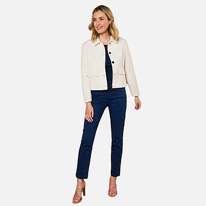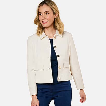 Embrace the elegance and versatility of the Emreco classic collar cropped boucle jacket, your go-to piece for seamless transition between seasons. Crafted in a flattering tailored fit, this jacket features a sophisticated, classic collar neckline, complemented by a button-down front fastening adorned with gold buttons. Two faux front pockets add a touch of detail, enhancing its overall appeal. Perfect for adding a soft, tailored touch to any ensemble, it promises to elevate your style effortlessly.