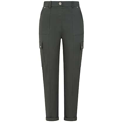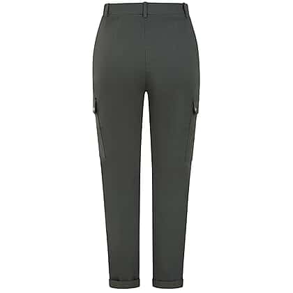 Refresh your casual collection with these Emreco combat-style stretch utility trousers in dark khaki, a flattering mix of structure and comfort. The cargo-inspired pockets and button detailing elevate the look, while the high-rise waist enhances shape and provides a secure fit. Crafted from a stretch fabric blend that feels smooth and moves easily, these trousers are ideal for both on-the-go days and casual evenings. The cuffed hems give a refined edge, pairing beautifully with trainers or ankle boots.