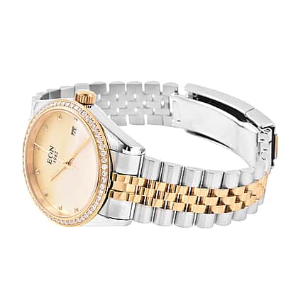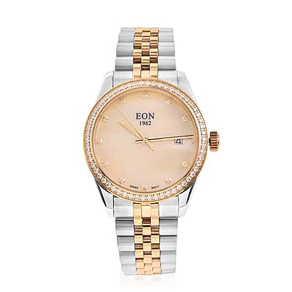 EON 1962 Swiss Movement 5ATM Water Resistant Watch with White Moissanite Embellishments, Yellow Mother of Pearl Dial and Dual Tone Stainless Steel Strap