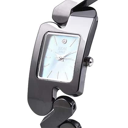EON 1962 Swiss Movement Water Resistance Diamond Studded Rectangular Watch with Grey Mother of Pearl Dial and Black Ceramic Strap in Silver Plating