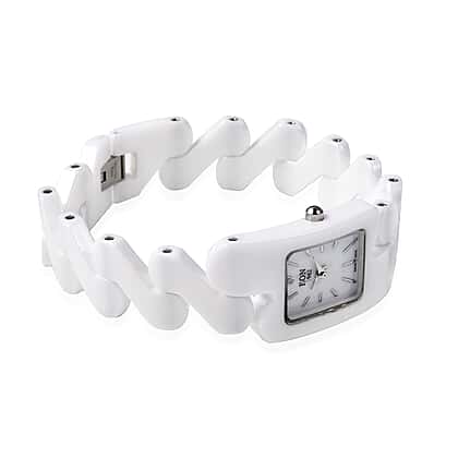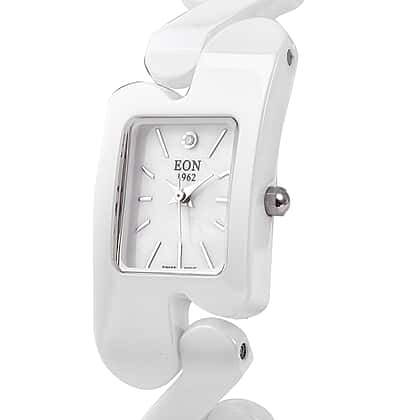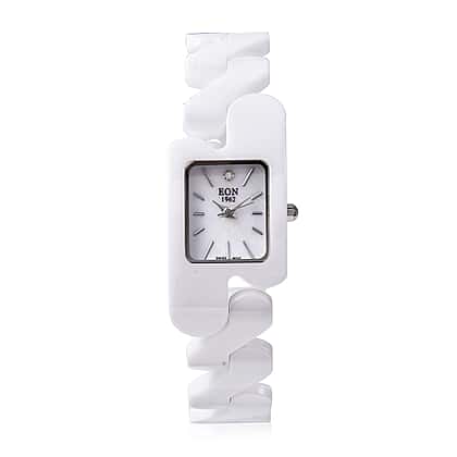 EON 1962 Swiss Movement Water Resistance Diamond Studded Rectangular Watch with White Mother of Pearl Dial and White Ceramic Strap in Silver Plating