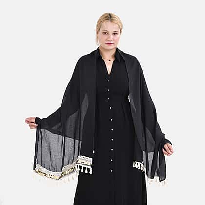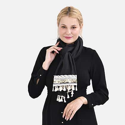 Complete your look with this Scarf with lace & tassels, designed to bring a refined touch to any outfit. Made from soft and lightweight polyester, it drapes beautifully while adding a layer of comfort. The classic black shade makes it a perfect addition to your wardrobe, perfect for layering in any season. Its generous length allows for versatile styling, whether worn as a wrap, shawl, or loosely draped. Finished with delicate lace trim and tassel details, it’s ideal for both casual and formal occasions. One-size-fits-all, making it a go-to accessory for effortless elegance.