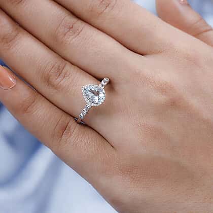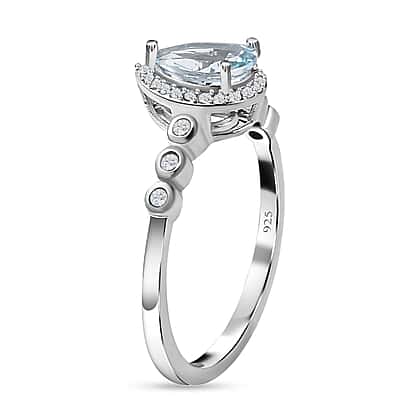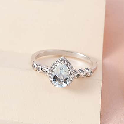 The pure blue of an Espirito Santo Aquamarine pear (8x6mm) takes centrestage in this 1.126-Carat ring (0.830 Carat) crafted in platinum overlay sterling silver. Surrounding the faceted cut Aquamarine are 40 glittering Cambodian zircons, each polished to perfection, lending them a fiery brilliance. Their pristine clarity makes them perfectly complement the Aquamarine, enhancing its beauty and radiance.