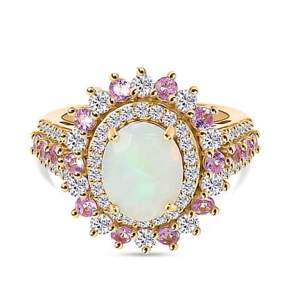 Ethiopian Opal, Pink Sapphire & White Zircon Cherry Blossom Ring in 18K Vermeil Yellow Gold Plating Sterling Silver 4.09 Ct.
