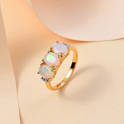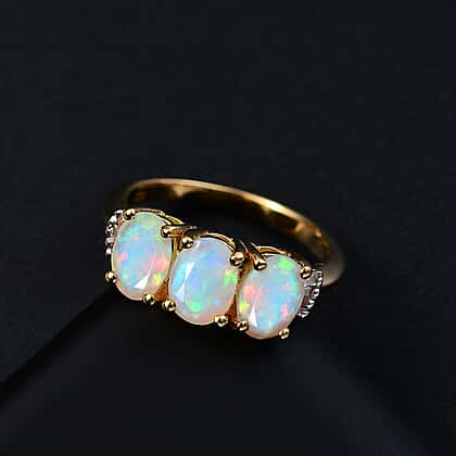 Ethiopian Opal, White Diamond 3-Stone Ring in 18K Vermeil Yellow Gold Plated Sterling Silver