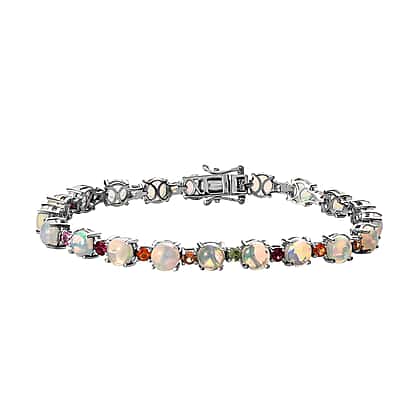 Ethiopian Opal and Multi Gemstones Cluster Bracelet 7.5 Inch in Rhodium Plated Sterling Silver