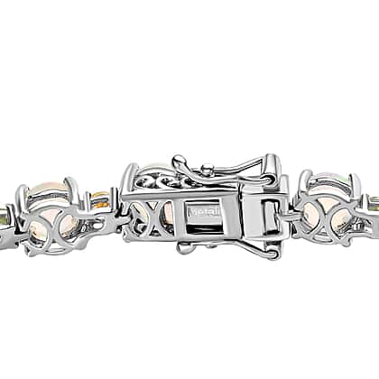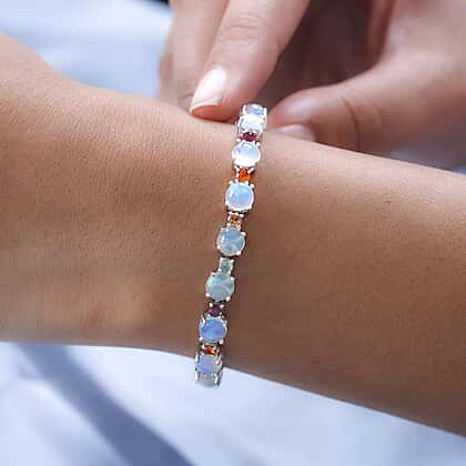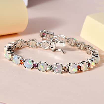 This Ethiopian opal and multi-sapphire bracelet features an alternating sequence of stone placement that lends vibrancy and colour to your attire. The bracelet features round opals with shimmering exteriors alternating with green, red pink, blue, orange and yellow sapphires. The Silver base is resistant to corrosion and plated with rhodium polish for a lustrous finish.