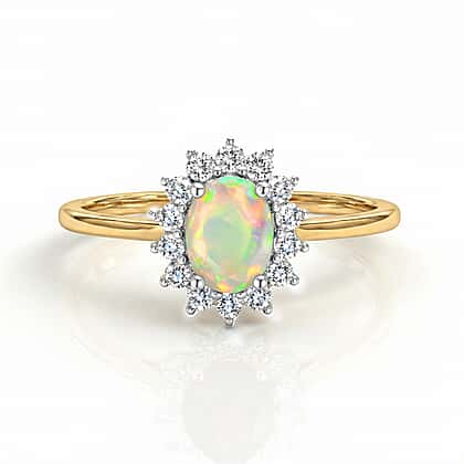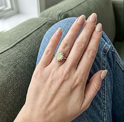 - Gemstone: Oval faceted Ethiopian Welo opal is the main gemstone surrounded by 12 round-cut Natural Cambodian Zircon which is adding an extra sparkle to the overall look of the 18K yellow gold vermeil over a sterling silver ring.