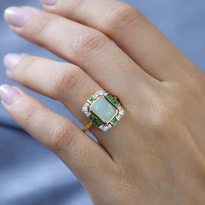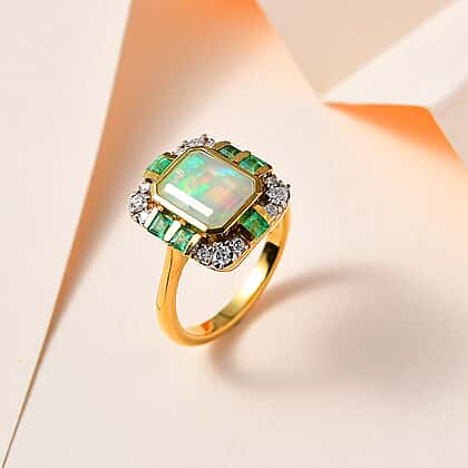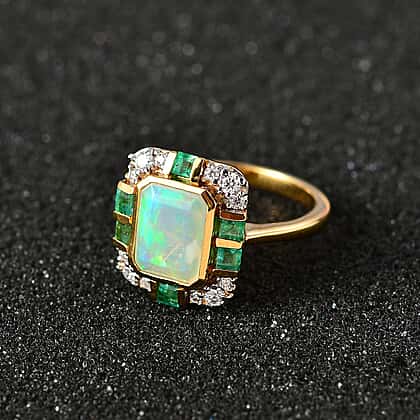 Ethiopian Welo Opal, Emerald & Moissanite Ring in 18K Vermeil Yellow Gold Plated Sterling Silver 2.00 Ct.