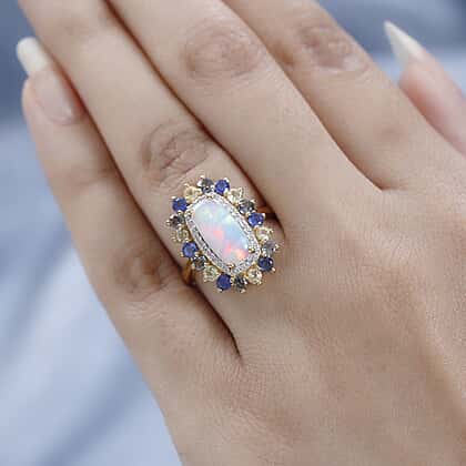 Ethiopian Welo Opal, Multi Sapphire & Natural Zircon Ring in 18K Yellow Gold Vermeil Plated Sterling Silver 3.31 Ct.
