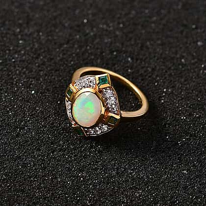 Ethiopian Opal, White Zircon, Zambian Emerald Ring in 18K Vermeil YG Plated Sterling Silver 1.81 ct 1.735 Ct.