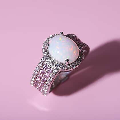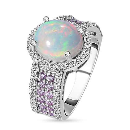 Ethiopian Welo Opal, Pink Sapphire and Natural Zircon Ring in Rhodium Overlay Sterling Silver 3.82 Ct, Silver Wt 5.00 Gms
